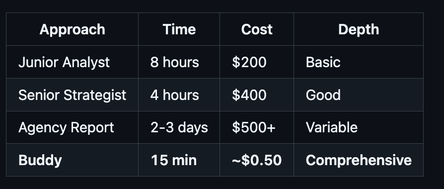 Here is why I built Buddy for you: this is your pain point, and I have been on both sides of the equation for 15+ years. My hope is that, from today onward, as I continue to enhance Buddy, it will save marketing teams, businesses large and small, that do not know where to start, what to do, or how to fix something, at a minimum of 40+ hours/month. The math below is based on data from some of the most trusted sources.