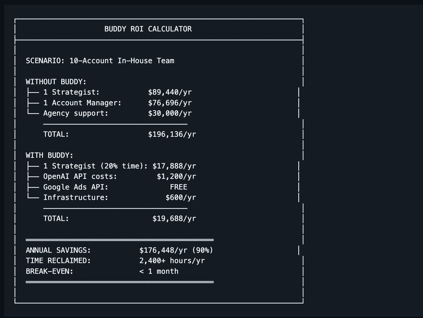 That question became Buddy. Buddy isn’t a dashboard. It’s not a reporting tool. It’s not another SaaS trying to “revolutionize” your workflow with 47 new tabs to manage. Buddy is a conversational AI that actually understands Google Ads, marketing, life, economics, and can, if you want, get to know you as a human. Ask it a question, get a question back, go deep, and then maybe you both can get to a solution. Ask it to do something, it does it (after showing you exactly what it’s about to do).