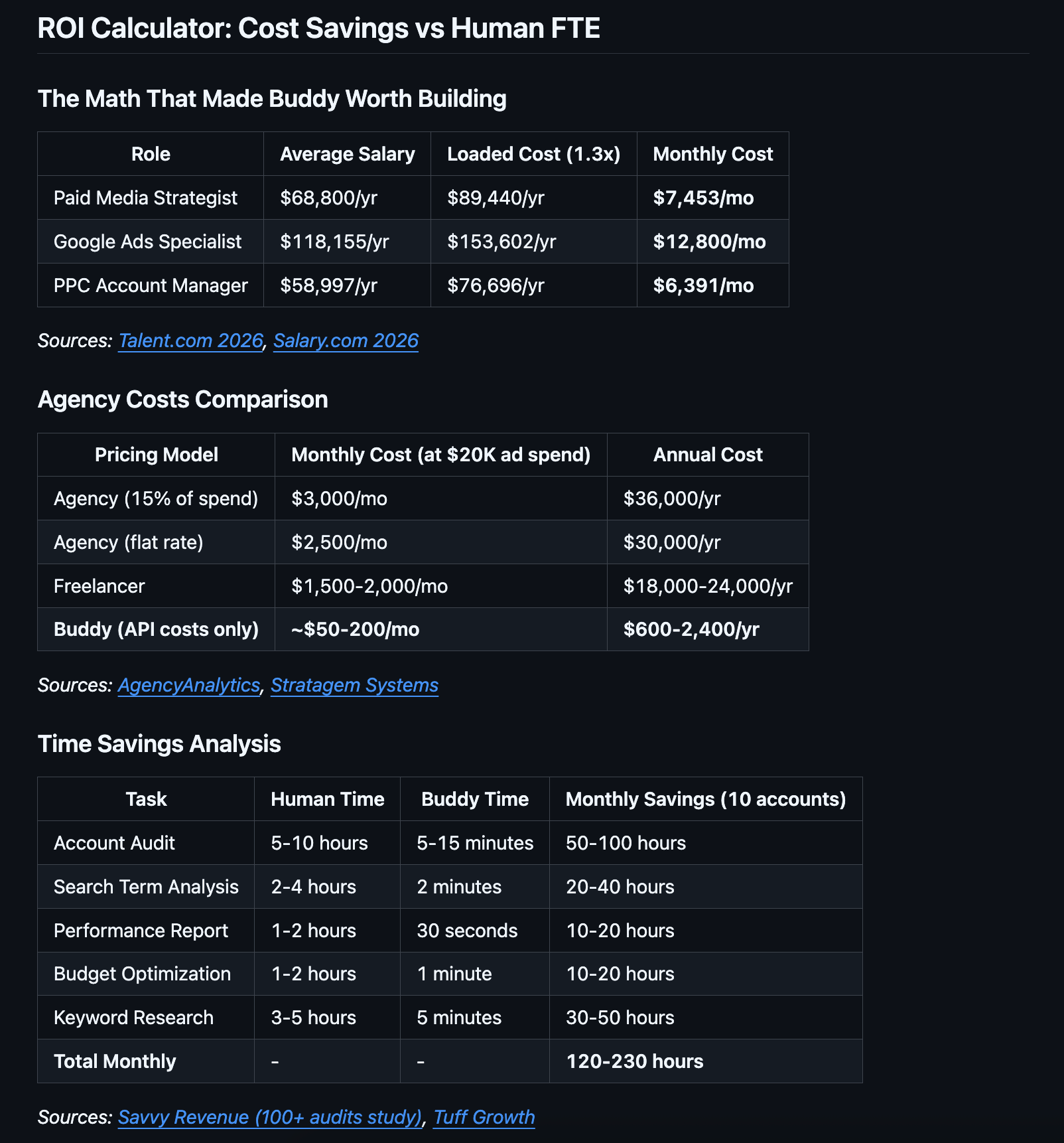 Buddy’s operating cost: About $50-200/month in API fees. Do the math. I did.