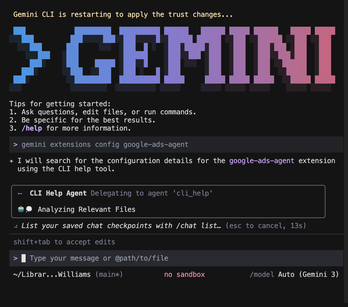 This extension implements every feature type in the Gemini CLI extension spec — the first Google Ads extension to do that. Here’s what that means:
